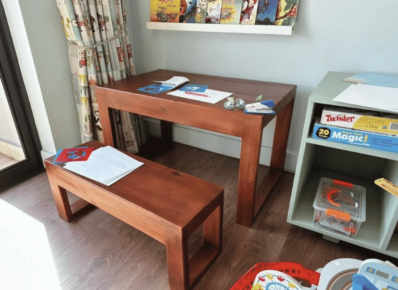 The Toddler Table Set is a 1000mm solid wood table with matching bench, perfect for play, crafts, and learning. Strong, safe, and child-friendly.